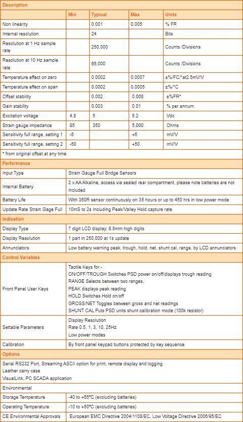 The 7-digit LCD display has peak and valley hold facilities. Calibration modes are auto, mv/v table or digital gain and offset. The display is TEDS enabled for automatic sensor calibration. For RS232 output option see the PSD232 portable strain gauge indicator for more details.